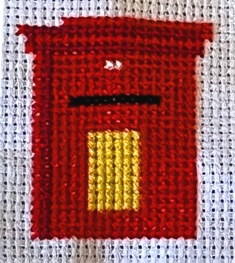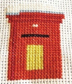 Finally, complete the cross stitching by sewing the holly leaves: deep dark green threads, added to the left hand side of the pillar box’s snowy